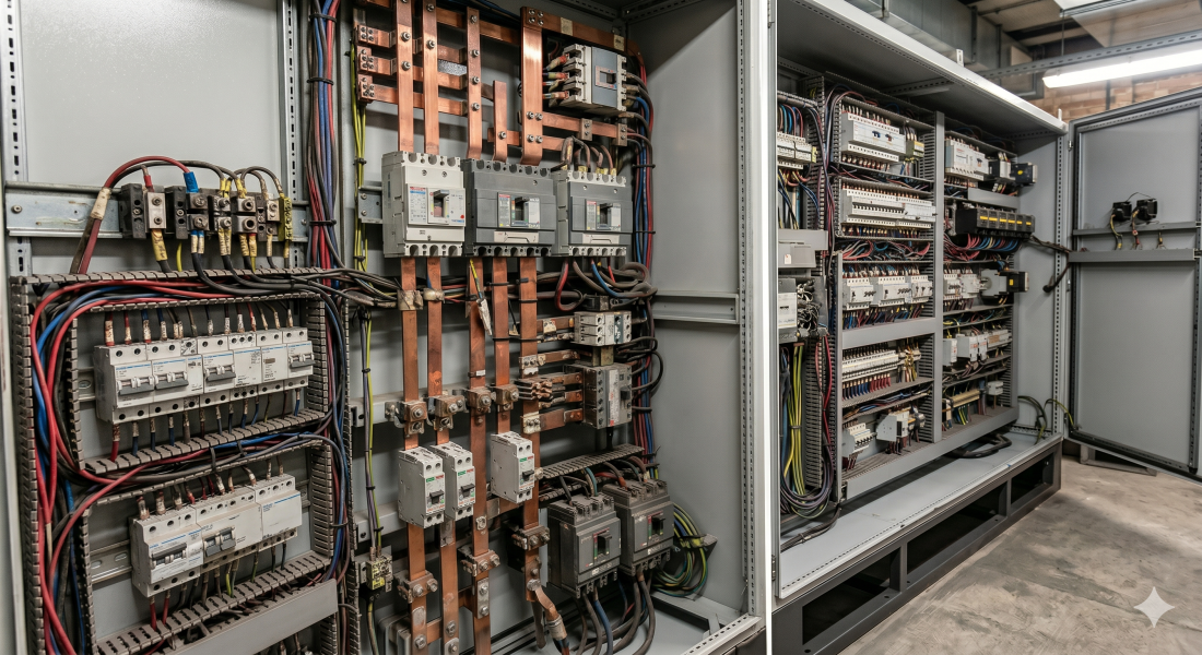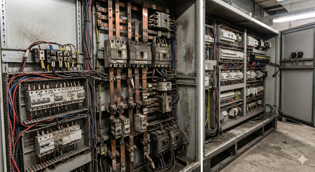 Avant / Après : Armoire TGBT à La Défense restaurée par nettoyage cryogénique AEROCRYO. Résultat : élimination des poussières carbonatées par sublimation, prévention des ponts thermiques et sécurisation contre les risques d’incendie.